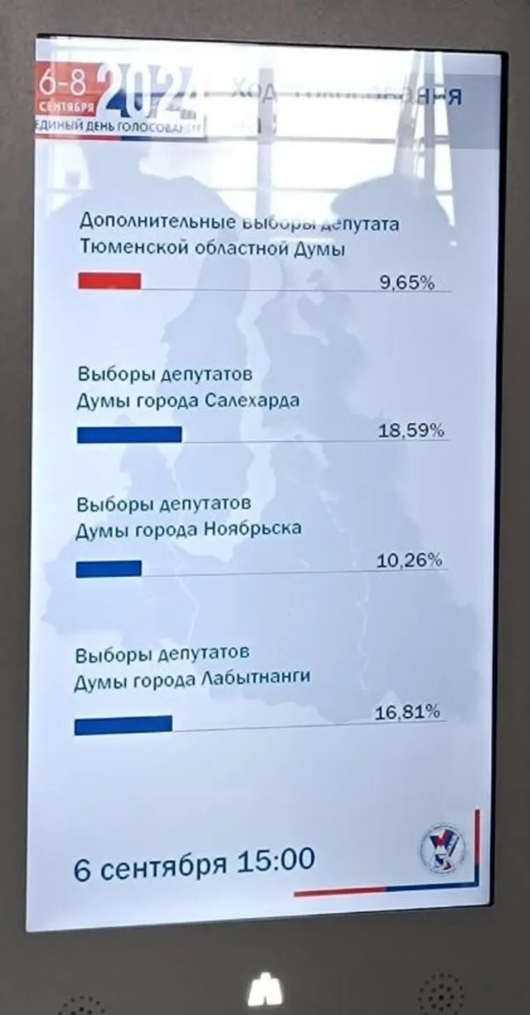 15:28 На 15 часов явка на избирательные участки Салехарда составила 18,59 %, Лабытнанги — 16,81%; Ноябрьска — 10,26%. На довыборах депутата в Тюменскую областную думу проголосовали 9,65% избирателей.