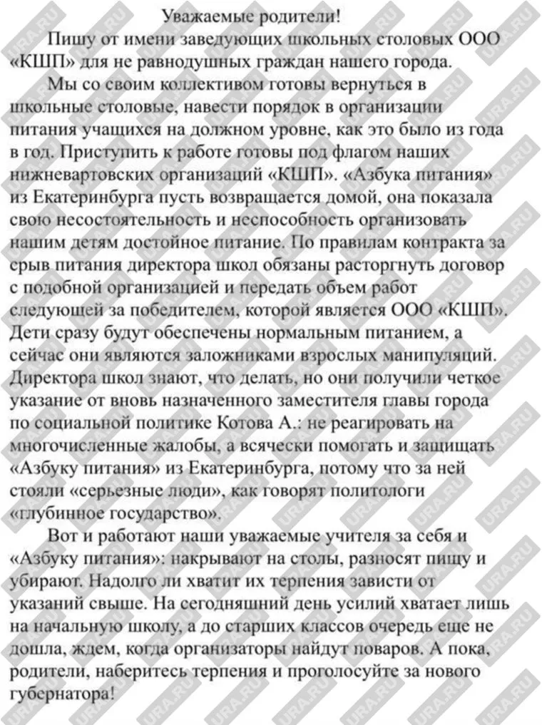 В соцсетях распространяется и другое письмо. Оно адресовано родительской общественности. Автор требует, чтобы «Азбука питания» «отправлялась домой» и обещает сразу же накормить всех голодающих школьников от мала до велика. Но здесь, как отмечают в нижневартовском соцблоке, есть проблема. Комбинаты Валетова размещены на базе помещений, собственником которых является КПСУ. «Будучи его директором, он сдал эти строения в аренду своим же комбинатам. И когда срок действия договора истечет, и если новый директор не согласится продлевать их, то у комбинатов Оганесовой и Валетова не будет ни соответствующих всем нормативам помещений, ни возможности готовить там школьные обеды», — поделился с URA.RU и.о. директора депсоцполитики Дмитрий Котов, много лет проработавший заместителем городского департамента образования.