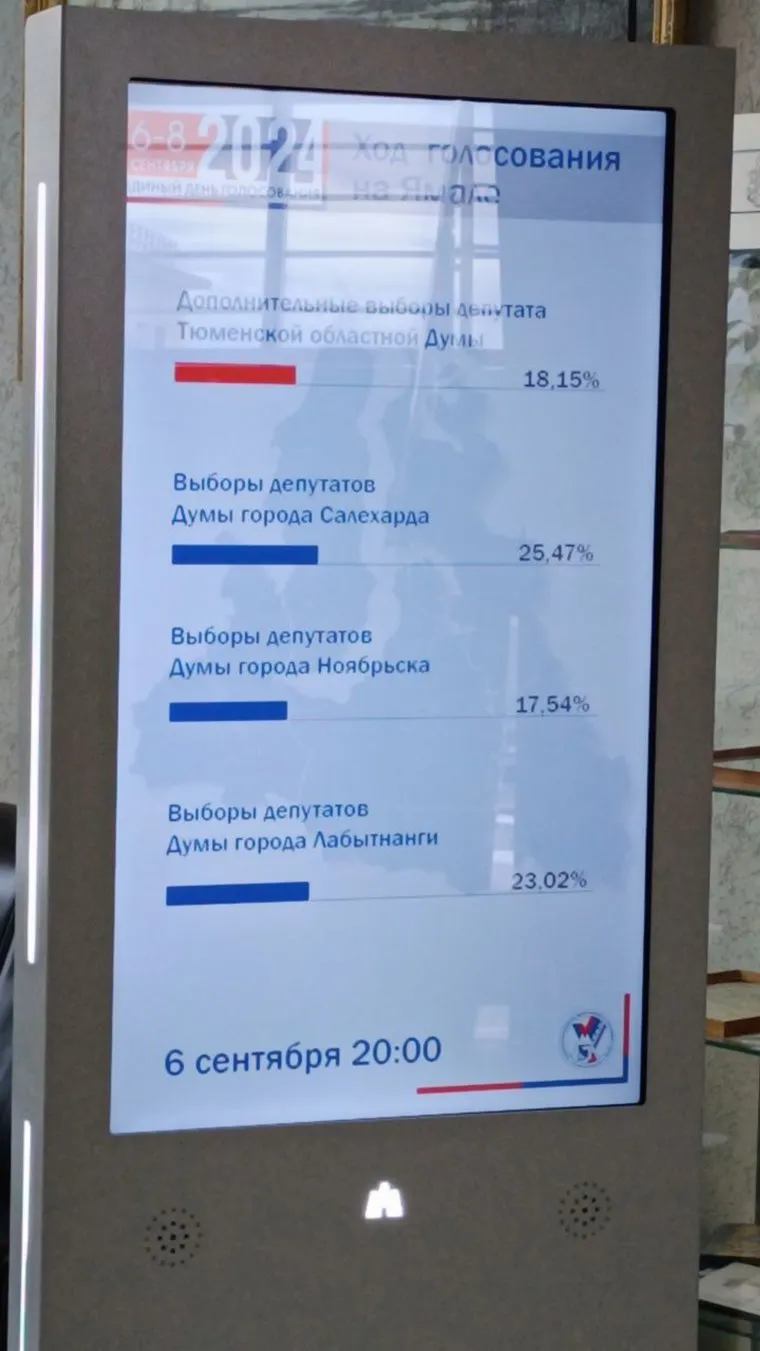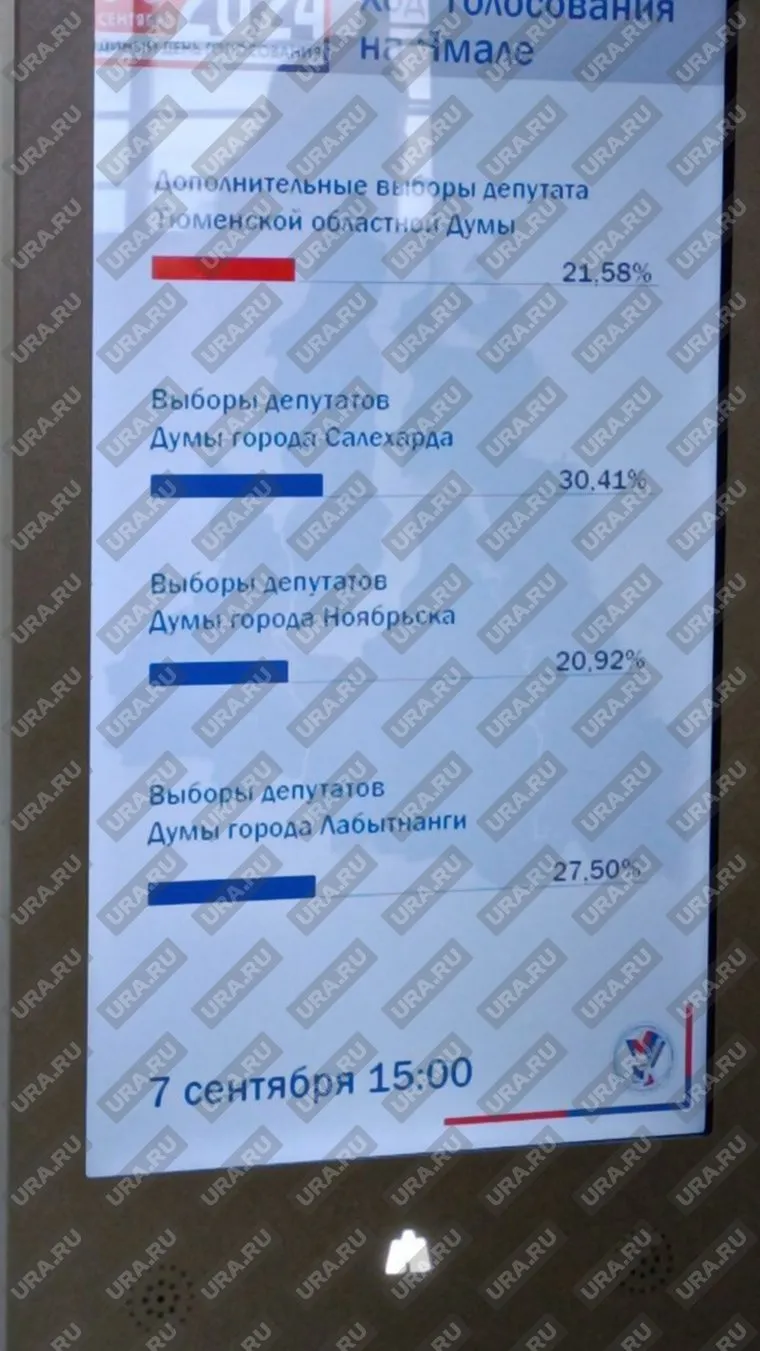15:27 По состоянию на 15:00 общая явка на избирательных участках составила 24,24%. В Салехарде явка составила 30,41% избирателей, в Лабытнанги — 27,50%, в Ноябрьске 20,92%. За депутата Тюменской областной думы проголосовало 21,58%.