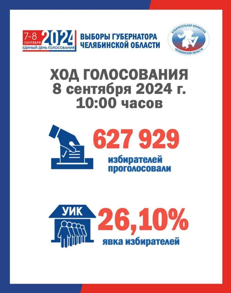 10:46 По состоянию на 10:00 проголосовали 627 929 жителей Южного Урала. Явка составила 26,10%, сообщили URA.RU в избиркоме области.