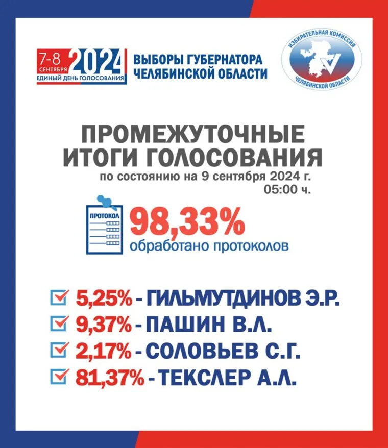 05:03 Избирком: 98,33% протоколов обработано в Челябинской области. «Промежуточные итоги голосования по состоянию на 9 сентября 2024 года 05:00. Обработано 98,33% протоколов. Текслер А.Л. — 81,37%», — сообщает пресс-служба избиркома Челябинской области в telegram-канале.