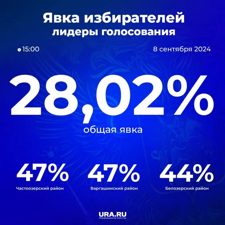 «По данным на 15:00 8 сентября, явка на выборах губернатора Курганской области составила 28,02%. Проголосовали 179 985 человек», — сообщили в telegram-канале избиркома.