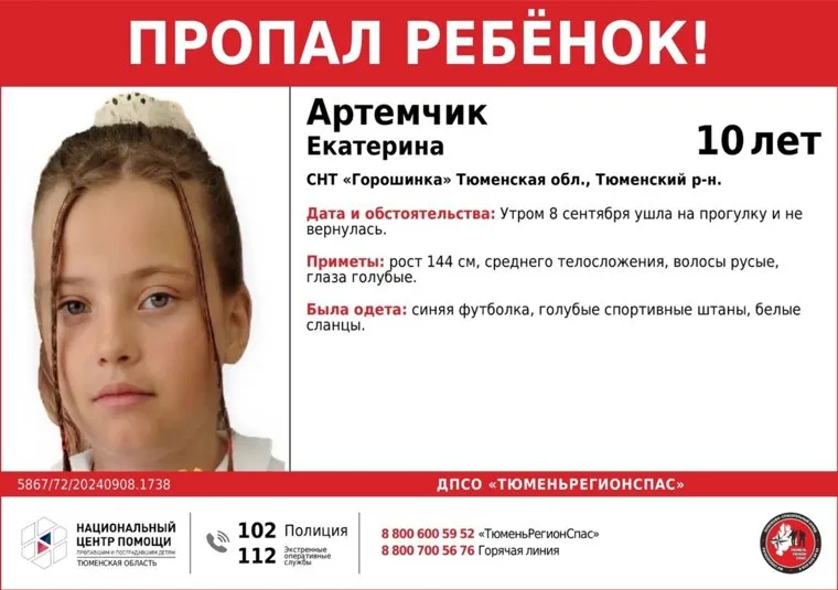 «Внимание! Сбор на поиск! Пропала Артемчик Екатерина Алексеевна, 10 лет (2014 г.р.). СНТ „Горошинка“ Тюменская обл., Тюменский р-н», — сообщается на сайте поискового отряда «ЛизаАлерт», а также на странице в соцсети vk.com ДПСО «Тюменьрегионспас».