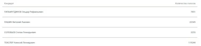 «У Текслера 119 244 голоса. Вторым идет Виталий Пашин (ЛДПР) — 22 549. Третьим — Эльдар Гильмутдинов (КПРФ) — 7 845», — указано на портале ДЭГ.