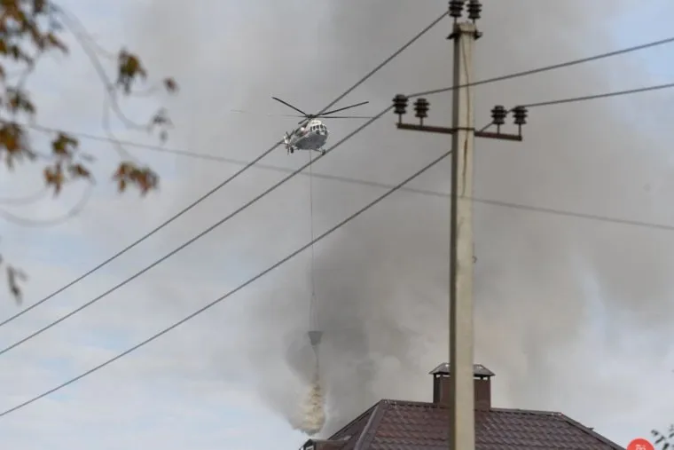 10:30 Пожар становится все меньше — помогли сбросы воды с вертолета. Густого черного дыма уже нет, передает с места происшествия корреспондент URA.RU.