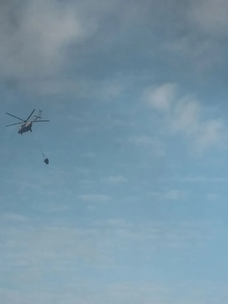 10:09 К тушению пожара привлекли вертолет Ми-8 МЧС России. Также на место происшествия следует мобильная лаборатория для замера воздуха.
