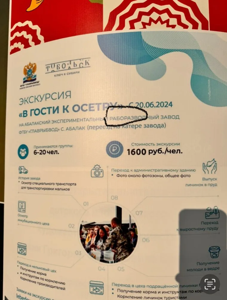 В Тобольске на рекламной афише, приглашающей на экскурсию, из-за опечатки рыборазводный завод стал «раборазводным». Снимком в социальных сетях поделились местные жители.