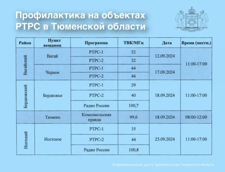 «Предупреждение о проведении профилактических работ на радиотелевизионных станциях в Тюменской области. С 12 по 25 сентября в отдельных районах планируются временные перерывы в трансляции эфирного телерадиовещания», — сообщает инфоцентр правительства Тюменской области со ссылкой на РТРС.