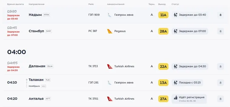 Скрин с официального онлайн-расписания Домодедово во вкладке «Вылет»