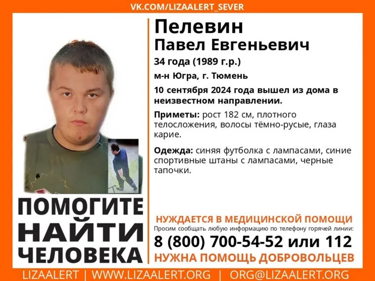 «Внимание! Помогите найти человека! Пропал Пелевин Павел Евгеньевич, 34 года. Микрорайон „Югра“, г. Тюмень. 10 сентября 2024 года вышел из дома в неизвестном направлении», — указано в публикации поискового отряда «ЛизаАлерт» Тюменской области.