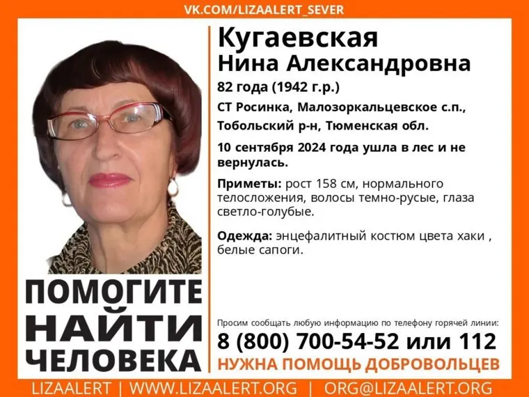 «Пропала Кугаевская Нина Александровна, 82 года. СТ Росинка, Малозоркальцевское с.п., Тобольский район, Тюменская область. 10 сентября 2024 года ушла в лес и не вернулась», — указано в сообщении поискового отряда в соцсети «ВКонтакте».