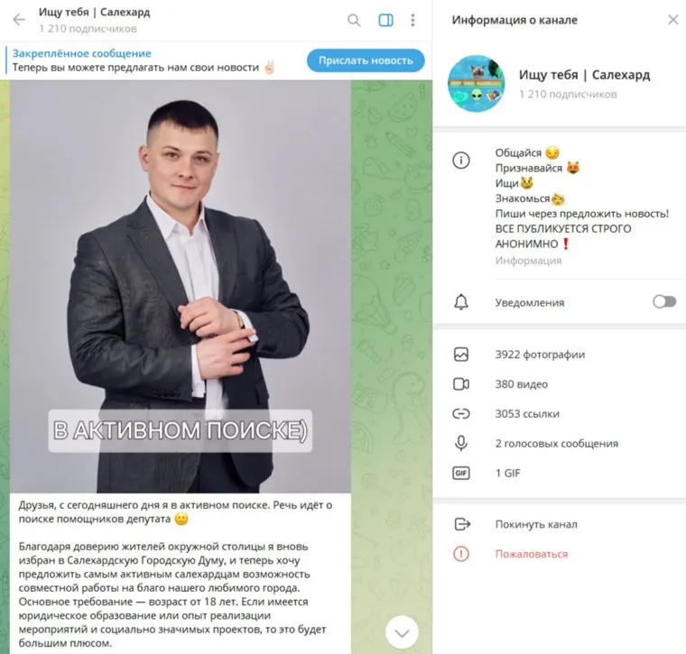 Объявление о наборе помощников для депутата думы Салехарда Романа Арефьева распространили в городском сообществе для знакомств. Публикация, в которой парламентарий призывает людей поработать на общественных началах появилась в telegram-канале «Ищу тебя — Салехард».