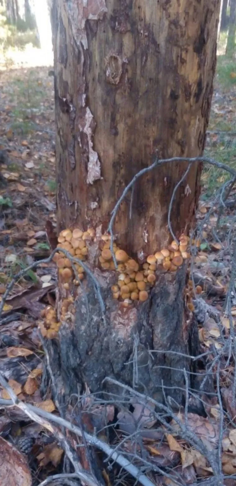 Житель Курганской области обнаружил семейство опят на сосне в лесу. По его словам, он впервые видит, чтобы эти грибы росли прямо на стволе дерева.