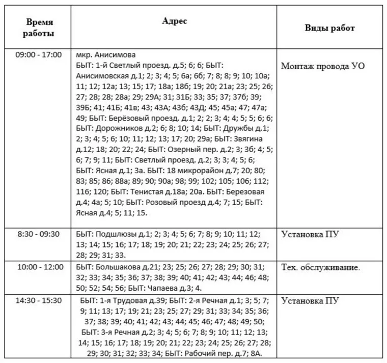С графиком отключений и адресами, где они произойдут, можно ознакомиться ниже. По всем вопросам необходимо обращаться по телефону оператора диспетчерской службы 222-132.