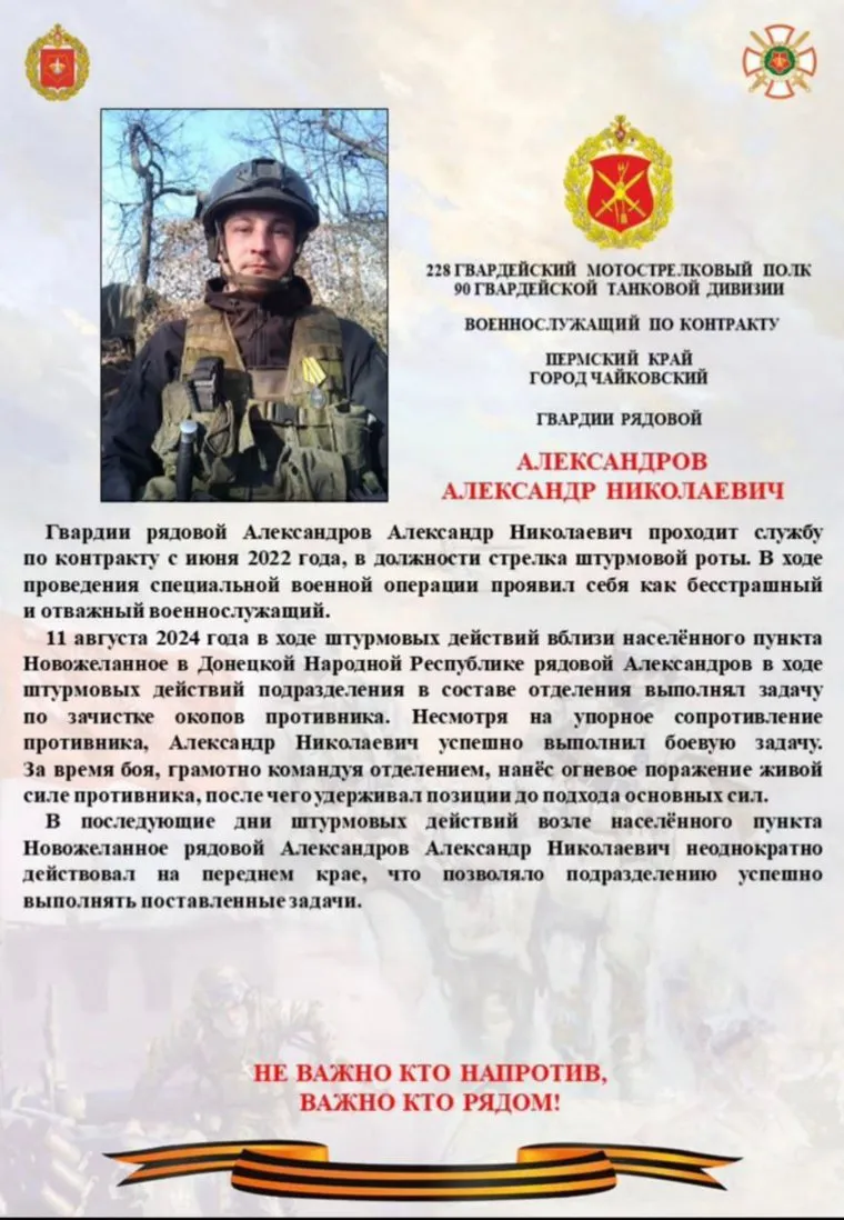 «11 августа в ходе штурма вблизи населенного пункта Новожеланное (ДНР) рядовой Александров в составе подразделения выполнял задачу по зачистке окопов противника. Несмотря на упорное сопротивление противника, Александр Николаевич успешно выполнил боевую задачу. Грамотно командуя отделением во время боя, нанес огневое поражение живой силе противника, после чего удерживал позиции до подхода основных сил», — пишут ветераны СВО со ссылкой на комитет ветеранов боевых Чайковского.
