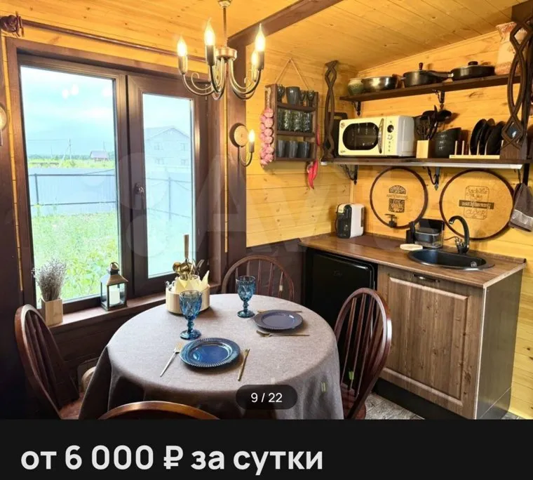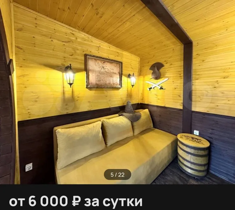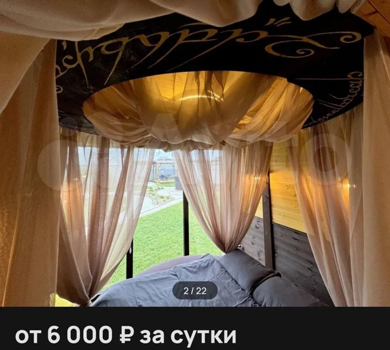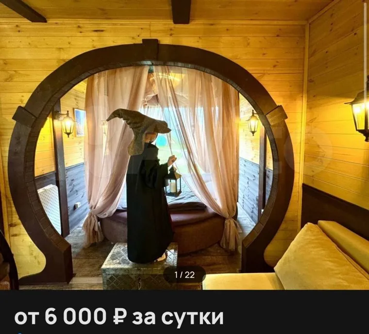 «Добро пожаловать в домик по мотивам саги о Хоббитах… Наш сказочный домик рассчитан на четырех гостей… Первое спальное место: круглая двухметровая кровать, украшенная балдахином и парящим кольцом всевластия… В домике вы сможете погрузиться в быт жителей Шира. Балки, арка, бочки ручной работы, круглый камин и огромное количество деталей», — пишет автор объявления.