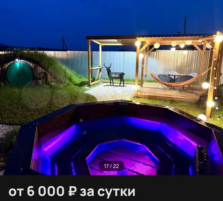 Также на территории дома есть «магическая чаша» — банный чан с подсветкой, который автор назвал «Зеркалом Галадриэль». Помимо этого, во дворе установлена фотозона «Хижина Хоббита» и беседка с качелями и гамаком.
