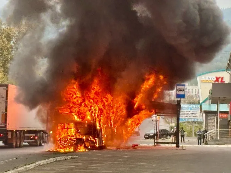 Пассажирский автобус сгорел на остановке утром в Миассе. Фото, видео