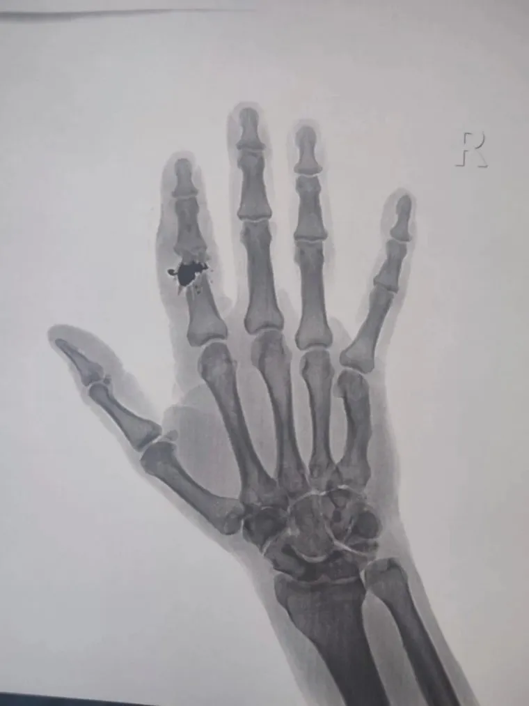 Фото рентгеновского снимка курганского бойца СВО, где видно, что кость мужчины на пальце раздроблена