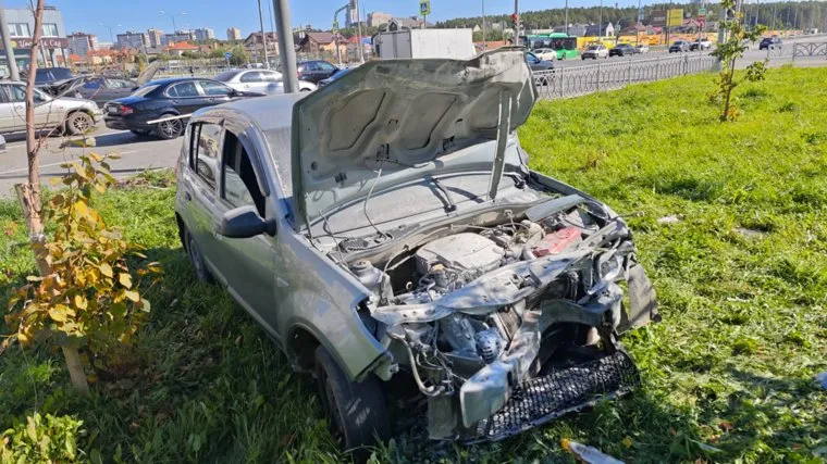 В Академическом районе Екатеринбурга днем 16 сентября пьяный водитель Renault врезался на скорости во впереди едущую машину, после чего снес ограждение и вылетел на газон. Иномарка задымилась, а мужчину вытащили из салона прохожие, рассказал URA.RU читатель.