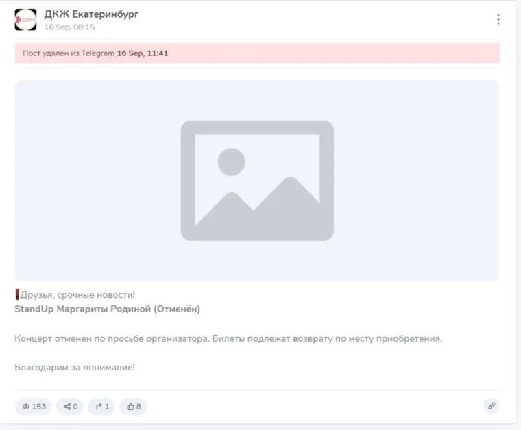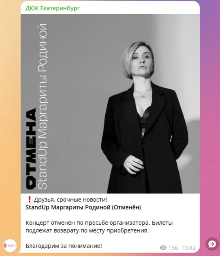 Дворец культуры железнодорожников (ДКЖ) спустя час удалил пост в telegram-канале о том, что в Екатеринбурге отменяется концерт участницы шоу «Женский стендап» Маргариты Родиной. Как пояснили URA.RU представители стендап-комика, билеты продаются в штатном режиме.