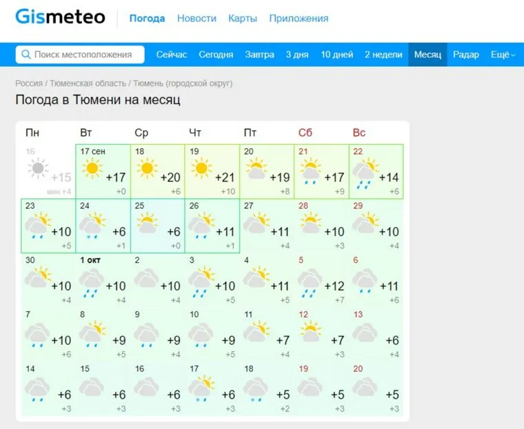 Тюмень на месяц останется без солнца. Облачные дни с периодическими осадками начнутся 20 сентября и продлятся весь октябрь, сообщает портал метеорологического ресурса Gismeteo.