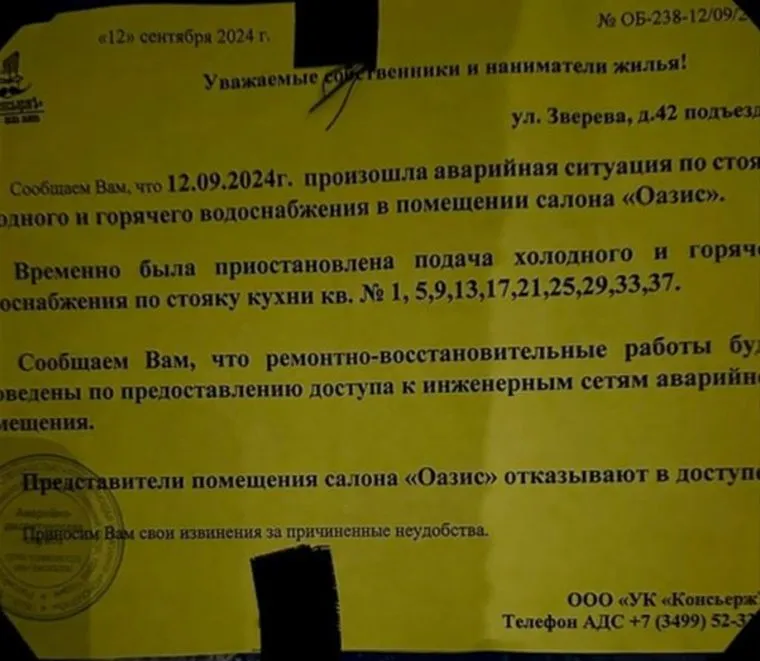 Жители дома №42 по улице Зверева в Надыме остались без горячей и холодной воды из-за хозяйки салона красоты «Оазис» — она не предоставила аварийной службе доступ к помещению, в котором произошла авария. Собственник салона связалась с руководством управляющей компании, которая обслуживает дом, но до сих пор не пустила ее сотрудников решить ситуацию, об этом URA.RU сообщили в диспетчерской службе УК.