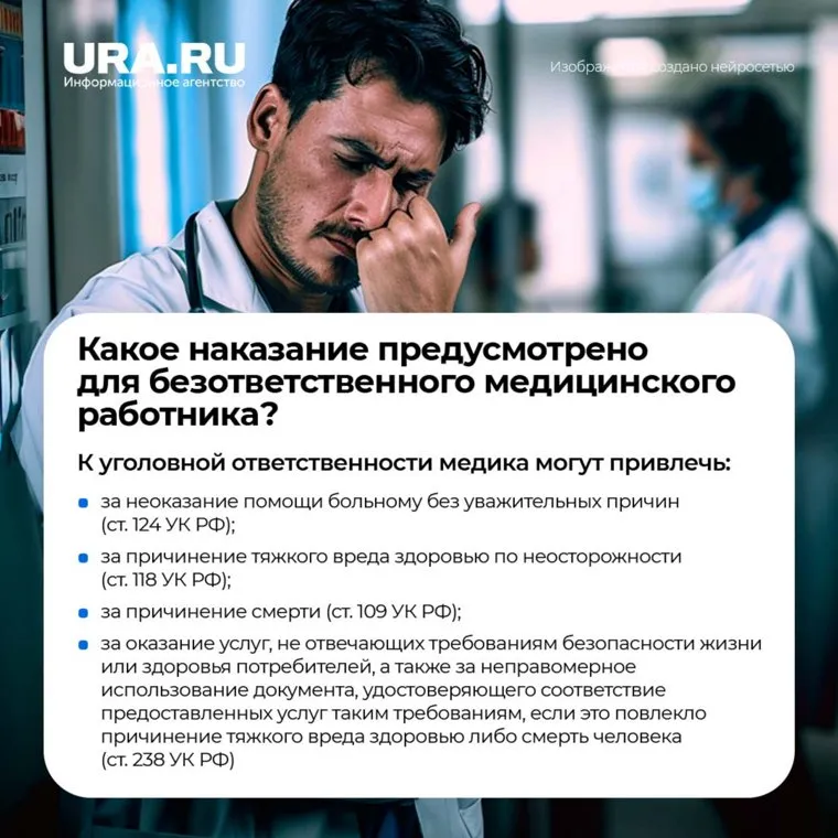 Медицинские работники могут быть привлечены к ответственности, которая включает наложение штрафа, назначение обязательных или исправительных работ. Также может быть полный запрет на осуществление медицинской деятельности или лишение свободы.