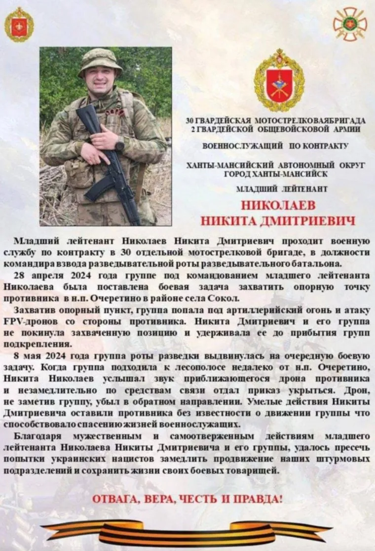 «Группе под командованием младшего лейтенанта Никиты Николаева была поставлена боевая задача захватить опорную точку противника в н.п. Очеретино в районе села Сокол. Захватив опорный пункт, группа попала под артиллерийский огонь и атаку FPV-дронов со стороны противника, но не покинула захваченную позицию и удержала ее до прибытия групп подкрепления», — сообщают власти окружной столицы в telegram-канале о подвиге земляка. Информация опубликована в боевом листке группировки войск «Центр».