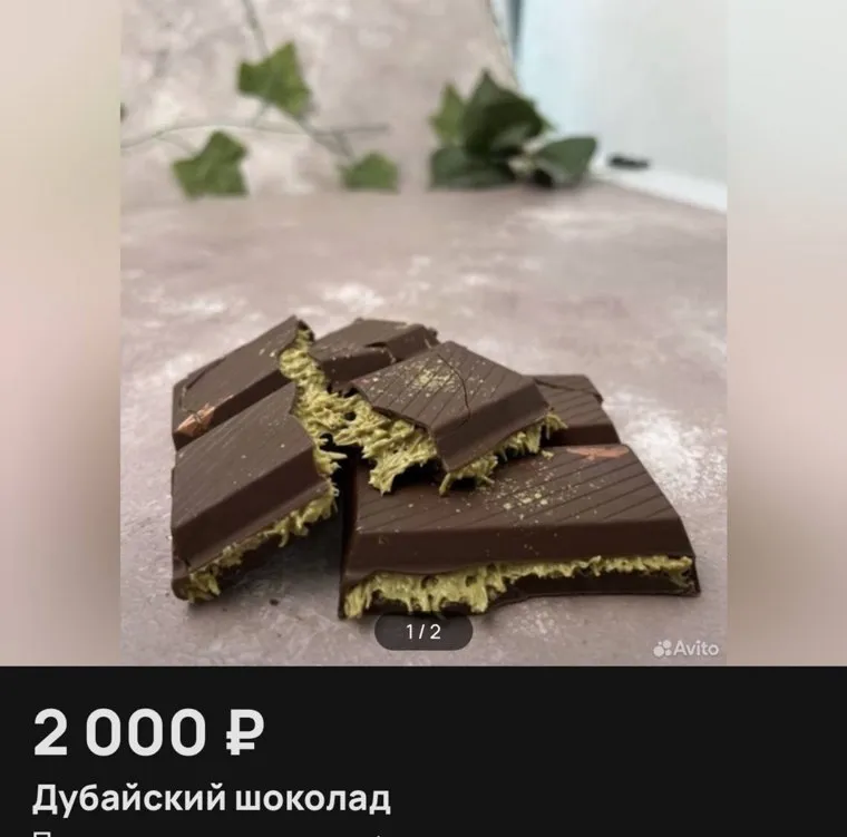«Дубайский шоколад. 2000 рублей шоколадка… Изготавливаю лично, на заказ… Состав: молочный шоколад, белый шоколад, кaтаиф, тахини, фисташковая паста, сливочное масло», — пишет продавец самой дорогой плитки.