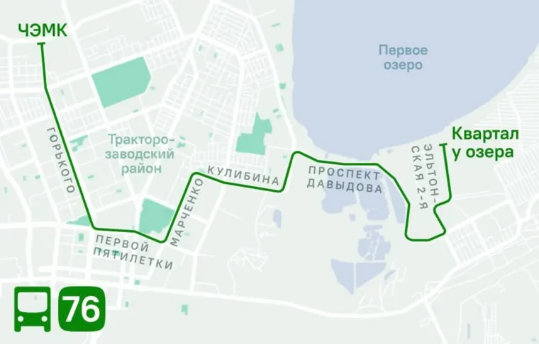 «С 20 сентября запускаем новый автобусный маршрут № 76 „Квартал у озера — ЧЭМК“ по регулируемому тарифу. Маршрут будет следовать по улицам 2-я Эльтонская, Трашутина, 1-я Эльтонская, проспект Виктора Давыдова, улицам Хохрякова, Кулибина, Марченко, Первой Пятилетки, Горького. На этом автобусе жители Чурилово смогут добираться до филиалов детской больницы № 1», — сообщили в пресс-службе.