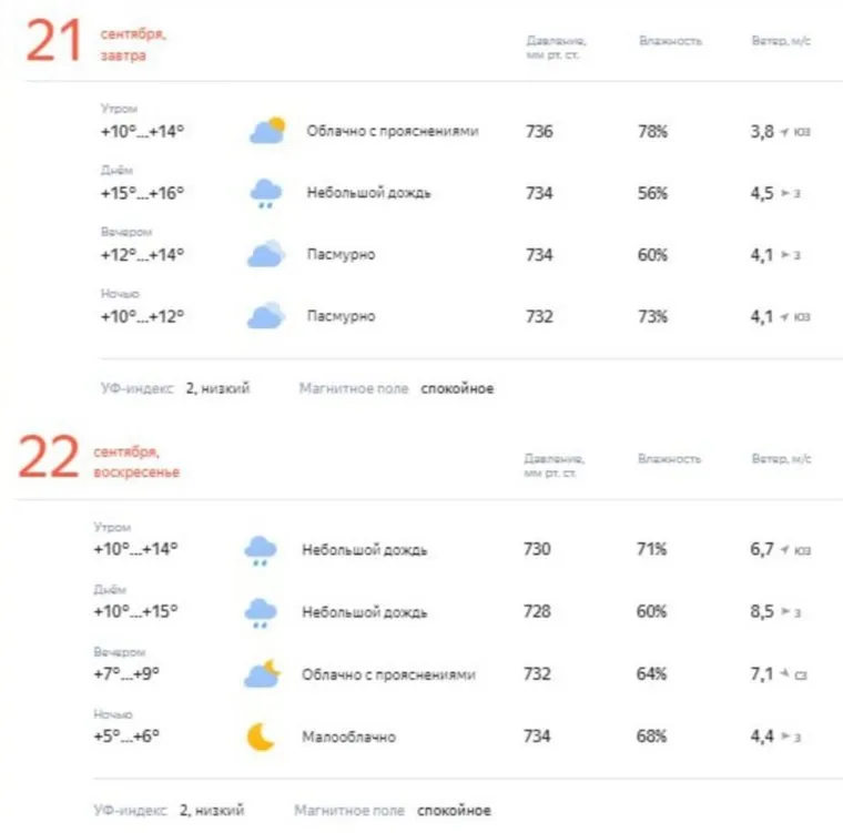 Дожди продолжаться и 23 сентября. В понедельник днем ожидается — +15, а к вечеру температура упадет до — 7. Ветер будет достигать 8,6 метров в секунду.