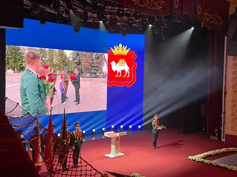 14:04 На сцену вынесли нагрудный знак губернатора, а также устав челябинской области и конституцию РФ.