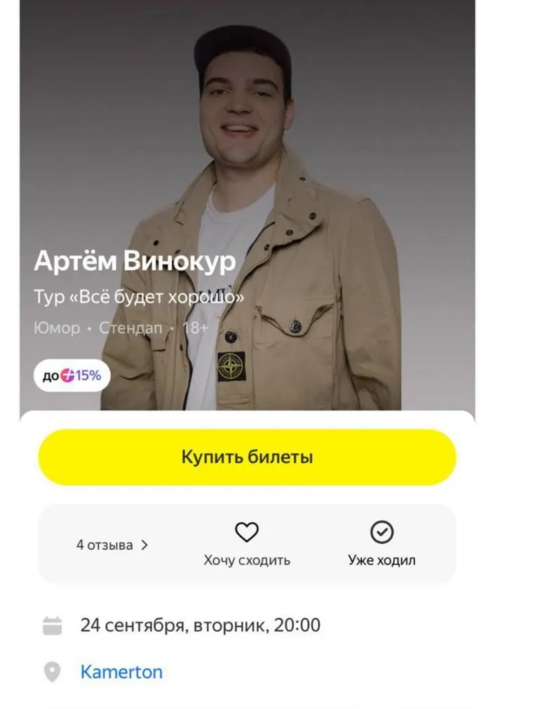 «Информация о проведении стендап-концерта Артема Винокура, на который продавались билеты на 24 сентября 2024 г., является недостоверной. Центр культуры „Камертон“ не является организатором данного мероприятия и не заключал договорных отношений с организаторами и агентами данного артиста», — следует из сообщения, опубликованного в telegram-канале «Камертона».