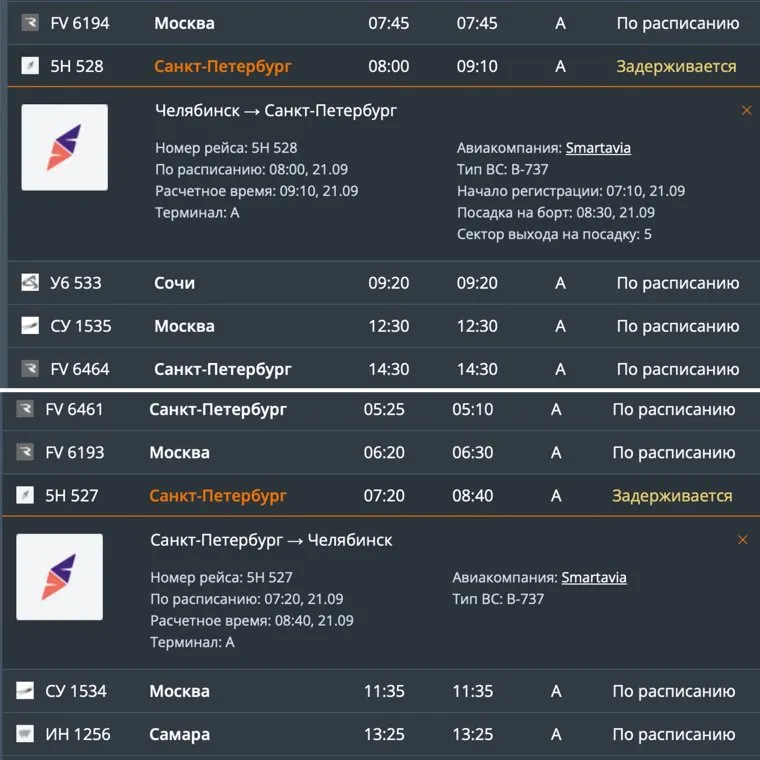 «Челябинск-Санкт-Петербург, 5Н 528. По расписанию — 8:00. Расчетное — 9:10», — говорится на сайте челябинской воздушной гавани.