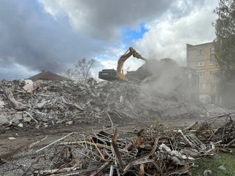 Спецтехникой разрушили четыре оставшихся подъезда, последний — сегодня днем. Сейчас на месте разбирают руины, территория огорожена.
