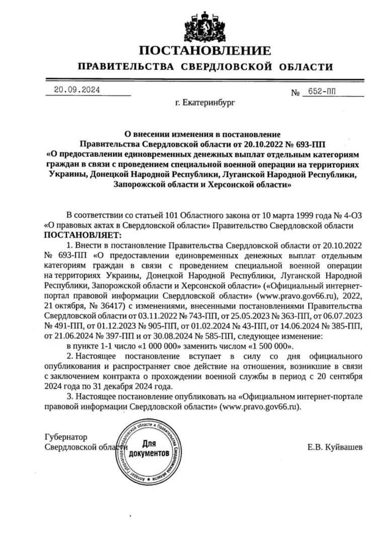 «В соответствии со статьей 101 Областного закона… „О правовых актах в Свердловской области“ Правительство… постановляет: внести… следующее изменение: в пункте 1-1 число „1000000“ заменить числом „1500000“. Настоящее постановление вступает в силу со дня официального опубликования и распространяет свое действие на отношения возникшие в связи с заключением контракта о прохождении военной службы с 20 сентября по 31 декабря», — говорится в документе. С учетом этого решения величина выплат в общей сложности достигнет более двух миллионов рублей, что включает в себя 100 тысяч рублей от муниципальных властей, 400 тысяч рублей в виде федеральной выплаты от Минобороны, а также 20 тысяч рублей на каждую семью и дополнительно на каждого ребенка, предоставляемые из регионального бюджета.
