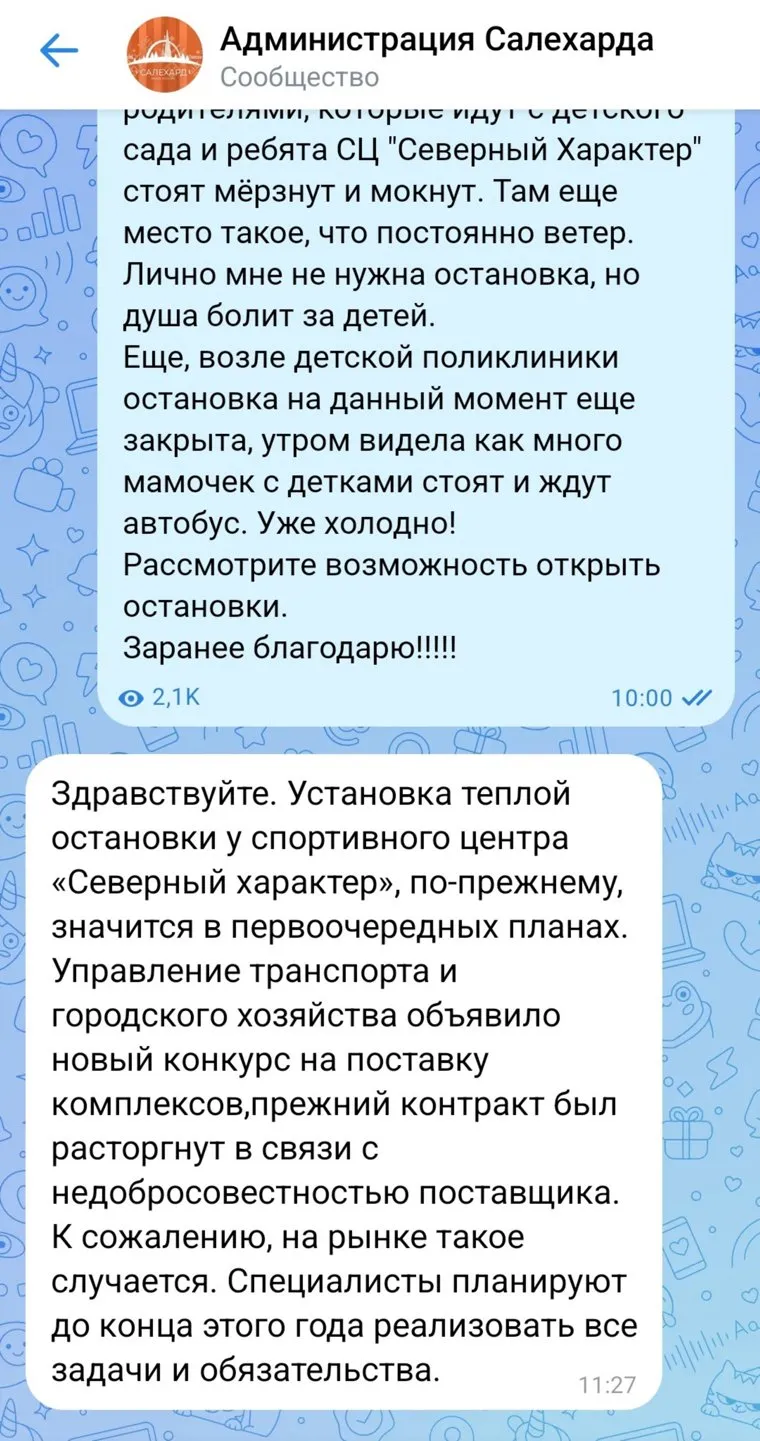 «Установка теплой остановки у спортивного центра значится в первоочередных планах. Администрация объявила новый конкурс на поставку комплексов, прежний контракт был расторгнут в связи с недобросовестностью поставщика. К сожалению, на рынке такое случается», — передает сообщение администрации в своем посте, цитируя последнюю фразу в своем посте VK.