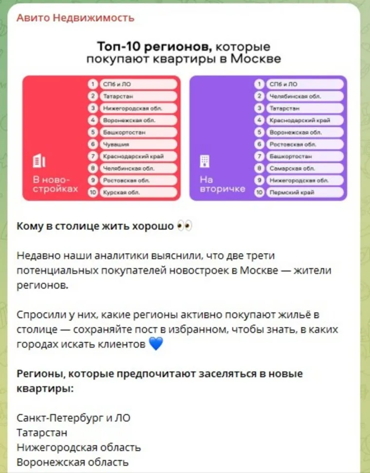 «Челябинская область находится на второй позиции в топе регионов, которые покупают недвижимость на вторичном рынке столицы. Первое место у жителей Санкт-Петербурга, третье — у Татарстана», — написал телеграм-канал «Авито Недвижимость».