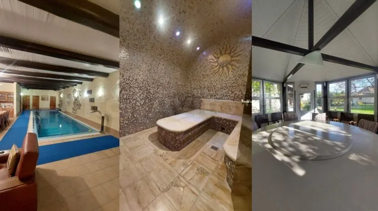«На участке площадью один гектар находятся: трехэтажный коттедж, банно-оздоровительный комплекс с бассейном, жилой двухэтажный дом, гостевой дом», — указано в объявлении. Также на участке есть дом для охраны, помещение для хозяйственных нужд, закрытая беседка для барбекю и три отапливаемых гаража.