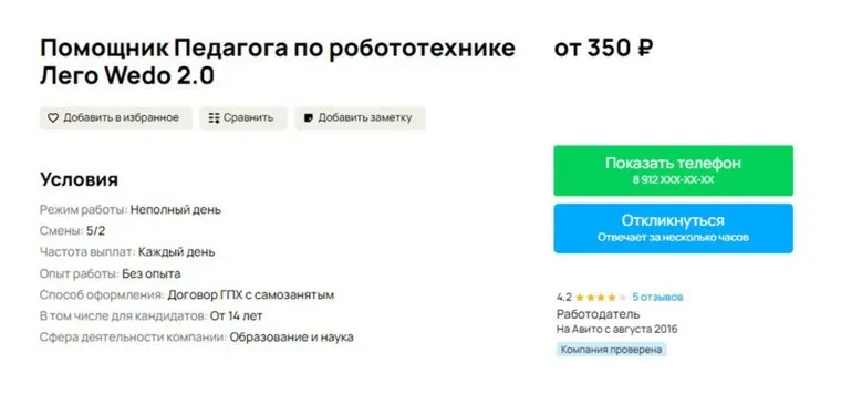 Помощника педагога по робототехнике со ставкой 350 рублей в час ищут в детский клуб. В компанию готовы взять подростков от 14 лет без опыта работы. Работник должен будет помогать детям от пяти до семи лет собирать конструкторы по инструкциям.