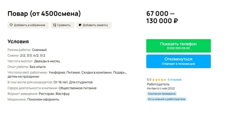 «Ищем повара шаурмы. Оплата: 300 рублей в час, от 67 тысяч рублей за 15 смен», — указал работодатель в объявлении. На вакансию могут откликаться как подростки, так и студенты. Одна рабочая смена оплачивается от 4,5 тысячи рублей.