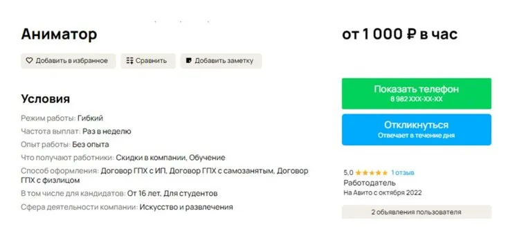 От 1000 рублей в час могут получать подростки, работая аниматорами. Кандидатам предлагают скидки в компании и оплачиваемую стажировку. «Если ты не работал [аниматором], но имеешь огромное желание, то мы всему обучим», — написал работодатель.