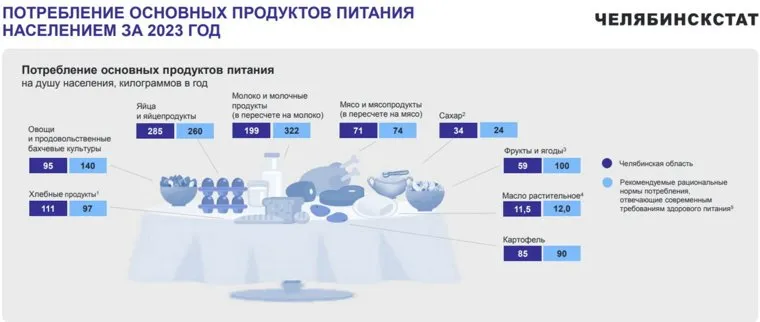 «Потребление основных продуктов питания за 2023 год. Хлебные продукты: факт — 111 кг, рекомендуемая рациональная норма, отвечающая современным требованиям здорового питания — 97 кг. Сахар: фактическое потребление — 34, норма — 24 кг», — отмечено в инфографике Челябинскстата.