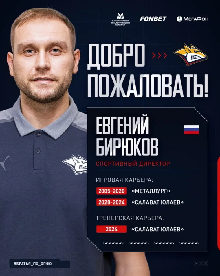 «Официально: Евгений Бирюков — спортивный директор „Металлурга“! Воспитанник магнитогорского хоккея возвращается в родную команду в новой должности. В обязанности Евгения Николаевича будет входить работа над трансферной политикой клуба, курирование всей спортивной составляющей системы „Металлурга“ и формирование состава команды мастеров совместно с тренерским штабом и руководством клуба», — сообщили URA.RU в пресс-службе клуба.