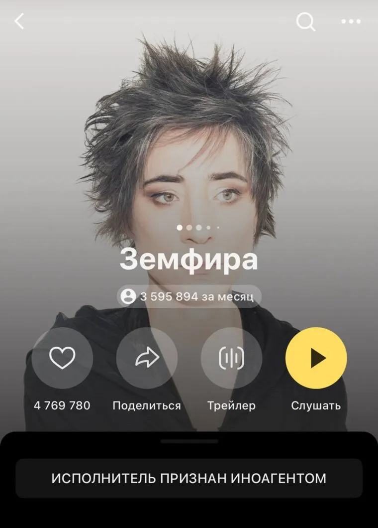 «Между фотографией исполнительницы Земфиры (полное имя — Земфира Рамазанова, признана Минюстом РФ иноагентом — прим. URA.RU) и ее популярными треками появилась соответствующая пометка. Раньше маркировка отсутствовала», — передает корреспондент URA.RU.