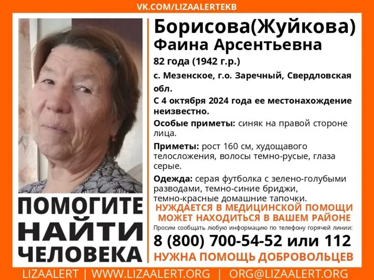 «Помогите найти человека! Пропала Борисова (Жуйкова) Фаина Арсентьевна, 82 года. Село Мезенское, городской округ Заречный, Свердловская область. С 4 октября 2024 года ее местонахождение неизвестно», — говорится в группе отряда в соцсети «ВКонтакте».