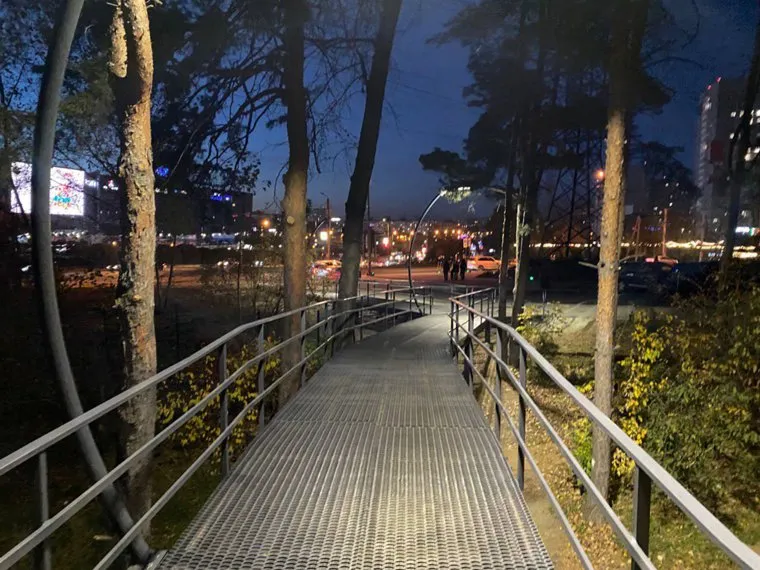 У нового пешеходного мостика у ТРК «Родник» в Челябинске появилось освещение. Фото