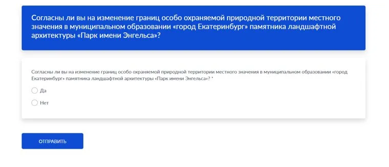 «Согласны ли вы на изменение границ особо охраняемой природной территории местного значения в муниципальном образовании „город Екатеринбург“ памятника ландшафтной архитектуры „Парк имени Энгельса“?» — говорится в опросе. Он пройдет до 14 октября.