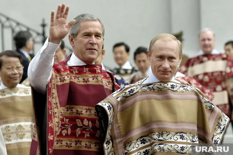 Президент России Владимир Путин и президент США Джордж Буш во время фотографирования с лидерами других стран-участниц форума АТЭС
